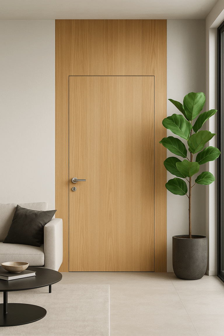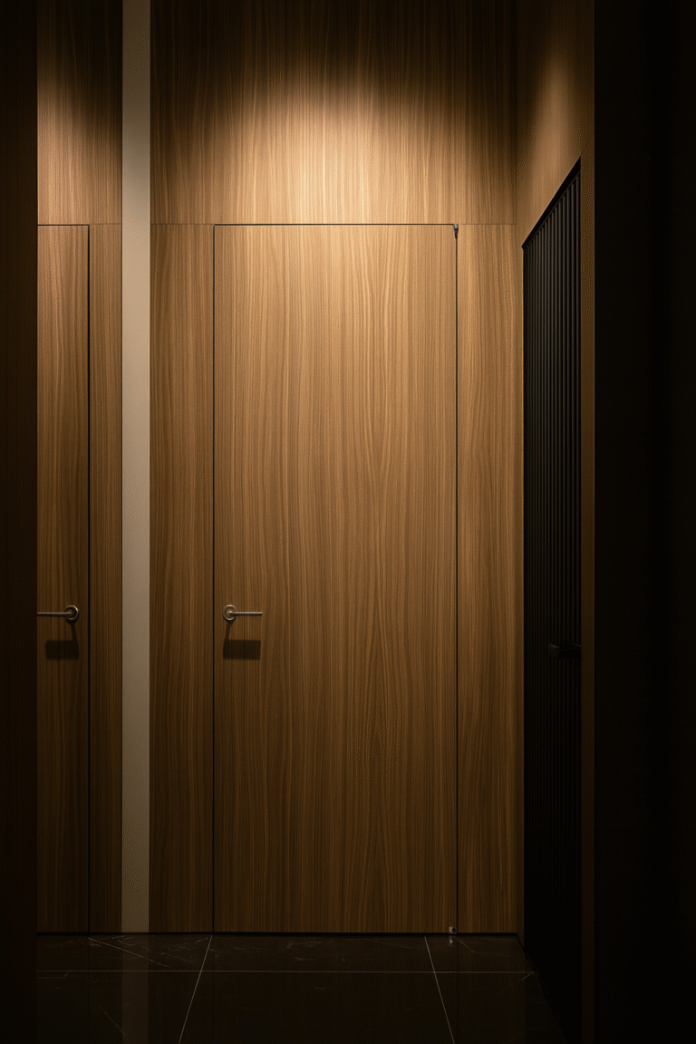 System ALU SEKRET daje możliwość tworzenia nowoczesnych boazerii ściennych – okładziny ściany mogą płynnie przechodzić w skrzydło drzwiowe, zachowując spójność wzoru i forniru.