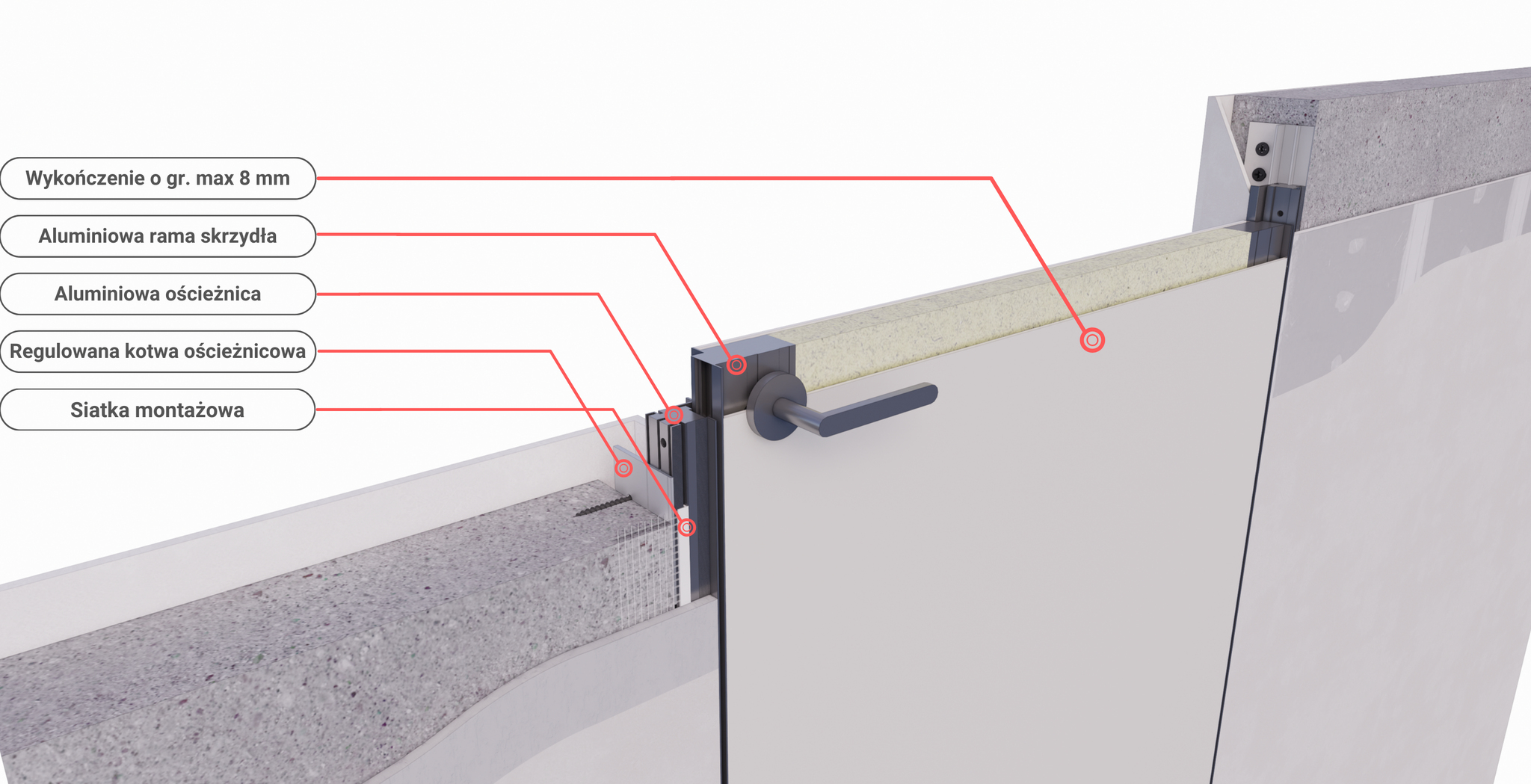 Ościeżnica aluminiowa została zaprojektowana z myślą o maksymalnej uniwersalności. Kierunek otwierania (do środka lub na zewnątrz) można ustalić bezpośrednio podczas montażu, bez konieczności wcześniejszego wyboru strony. Nowatorski system jednoetapowego montażu umożliwia szybkie i precyzyjne osadzenie zarówno ościeżnicy, jak i skrzydła.