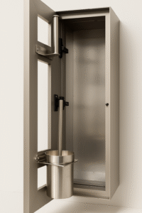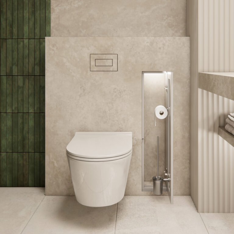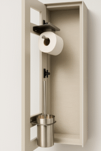 System pozwala ukryć najpotrzebniejsze akcesoria strefy WC — takie jak uchwyt na papier toaletowy, szczotka WC czy dodatkowa półka — bez rezygnacji z wygodnego dostępu na co dzień.
