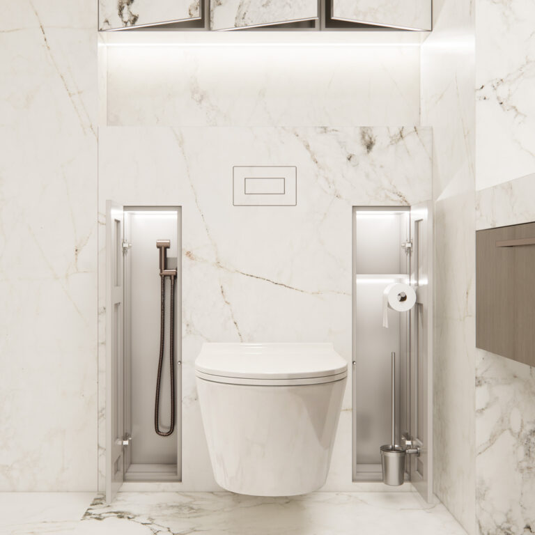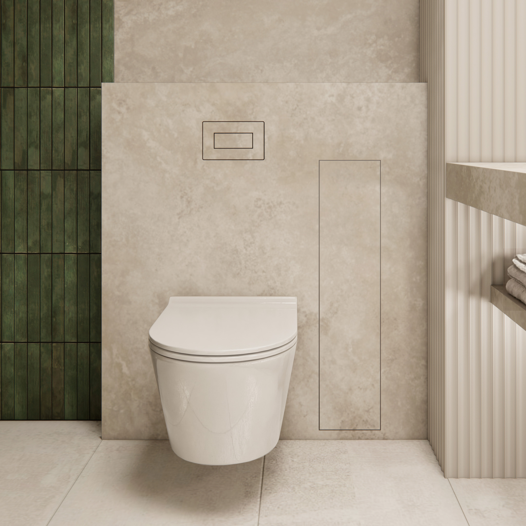 Nie jest to klasyczna szafka łazienkowa ani przypadkowa zabudowa. INTEGRA WC tworzy uporządkowany, zlicowany z powierzchnią ściany moduł, który może zostać dopasowany wymiarowo i wykończony materiałem zgodnym z projektem wnętrza.